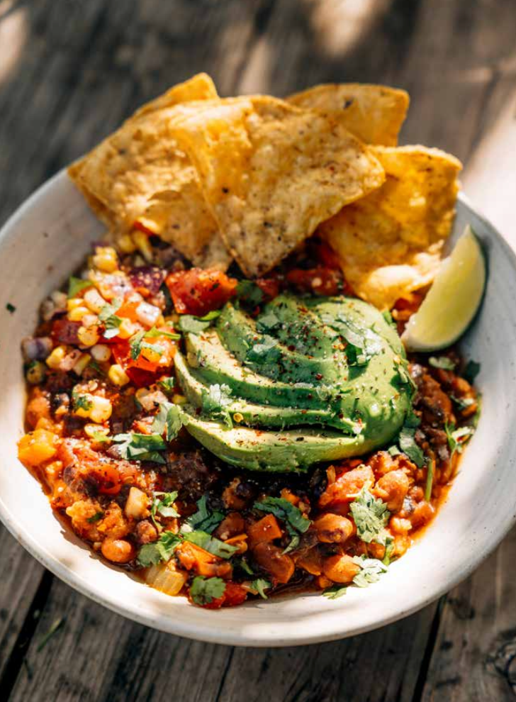 Chilli non Carne with Rice and Chips.